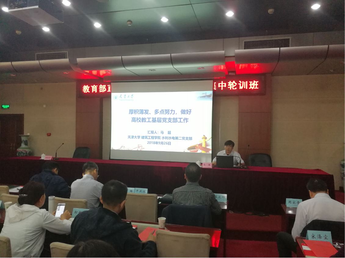 天津大学建筑工程学院水利水电第二党支部成立于2016年3月份。采取优化设置党支部思路,支部老师由水利水电-海上风电课题组和创新团队成员组成。目前,该支部有20名教工党员,下设2个党小组;支部班子由支部书记、纪检委员、组织委员和宣传委员组成,支部书记为水利系马超教授。支部成立3年多来,在学校党委和学院党委的领导和关怀下,在支部全体党员老师的团结努力下,紧扣新时代赋予高校教师党支部的职责和使命,以建成新时代学校和学院事业发展的坚强战斗堡垒和特色高校教工党支部为发展目标,围绕“教育、管理和监督党员” “团结、凝聚、宣传和服务师生”的工作要求,厚积薄发、不断努力拼搏,持续开展多层次工作,取得一定成绩。