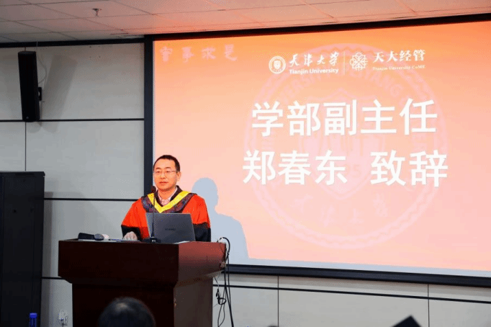 学部副主任郑春东首先发表致辞。他代表学部向圆满完成学业、即将迈向新阶段的2026届金融硕士毕业生表示热烈祝贺,并向辛勤付出的教师与家长致以衷心感谢。他充分肯定了同学们在学期间的笃学精神,赞扬大家扎实掌握金融理论工具,并在校训熏陶下培养了洞察本质的思维能力。他勉励全体毕业生:一要敬畏周期,保持定力;二要心怀敬畏,坚守底线;三要胸怀家国、经世致用,做有温度、有担当的天大经管人。