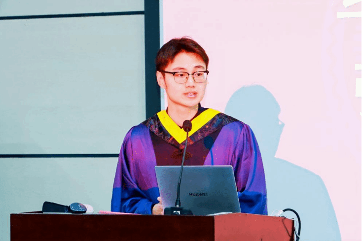 毕业生代表张权在发言中回顾了在学期间的成长历程。他表示,母校如沃土般给予滋养,图书馆的灯火、水果节的甘甜均成为温暖记忆;他感谢学校提供的跨学科平台与包容环境,让同学们得以践行“实事求是”校训,锤炼责任与担当。