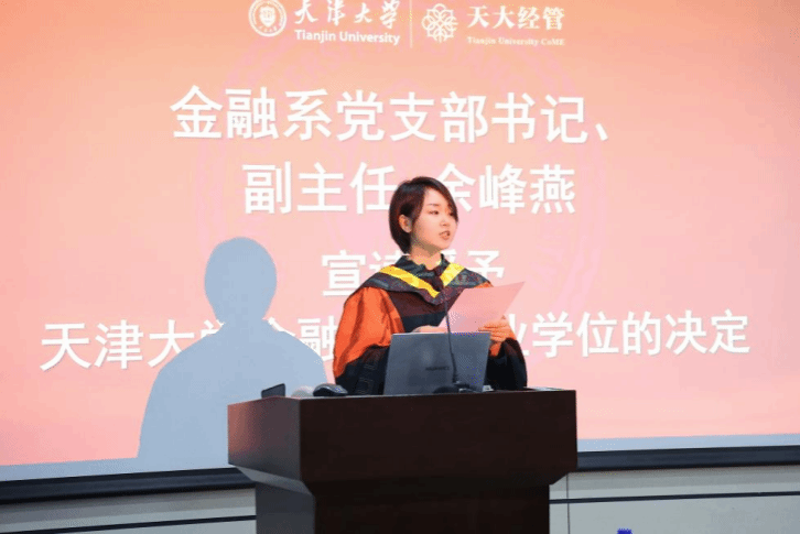 随后,金融系党支部书记、副主任余峰燕宣读了天津大学金融硕士专业学位授予决定,标志着毕业生们正式完成学业,开启人生新篇章。