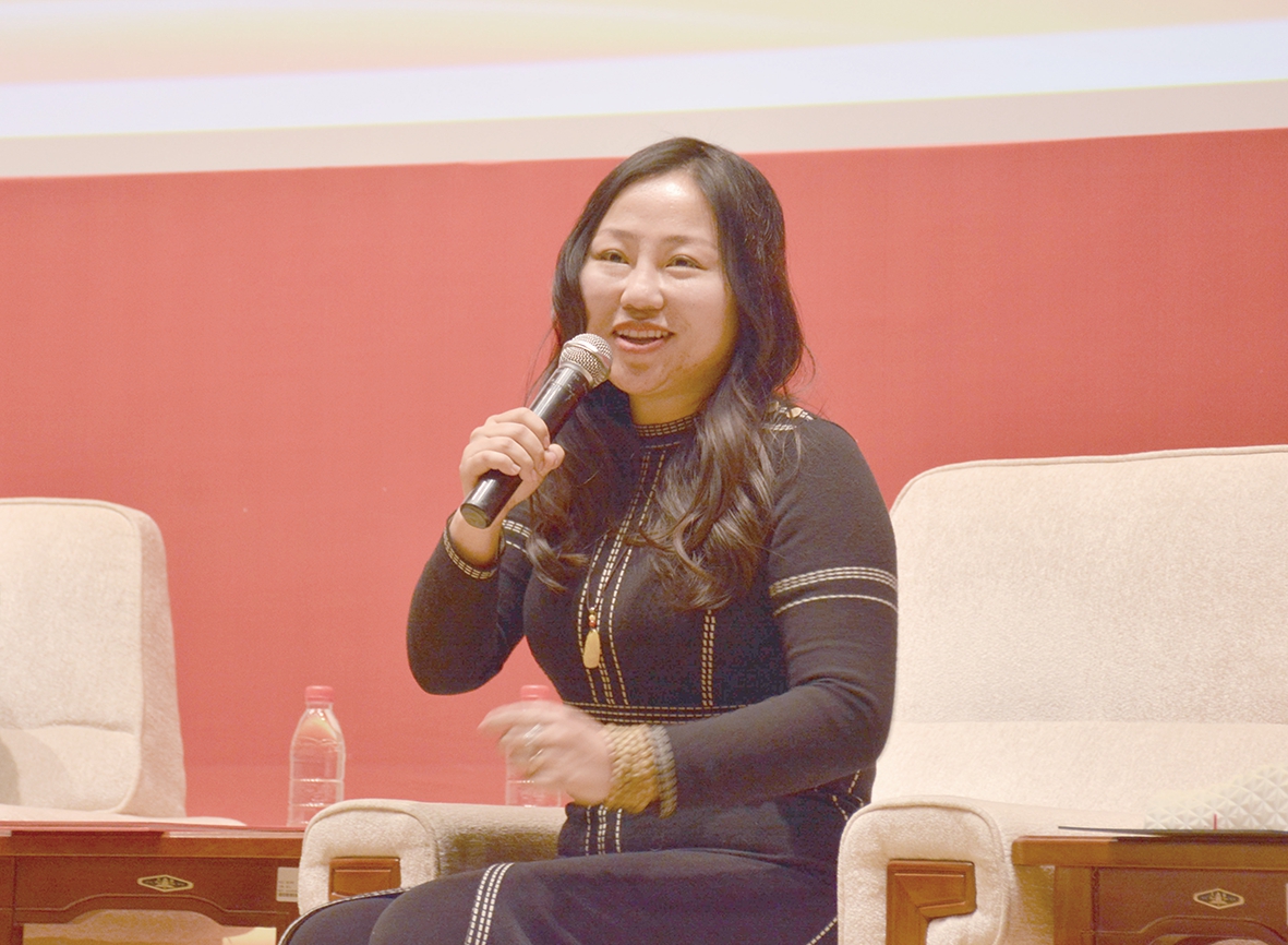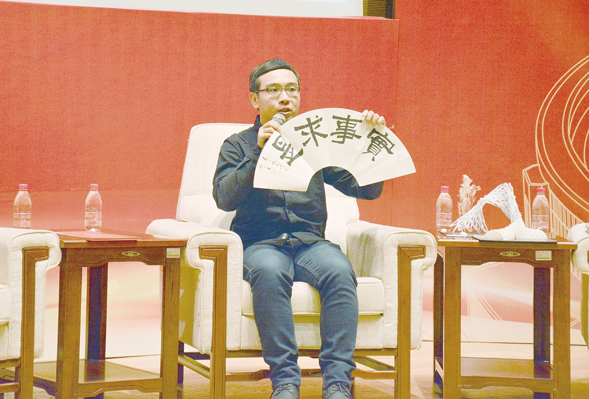“学如弓弩,才如箭镞”,这是习近平总书记在同各界优秀青年代表座谈时引用到的,鼓励青年人不断学习知识、增长才干,我认为与我们每个大学生、每个青年人都是非常贴切的。我的这幅作品的字体是1600多年前的爨体,我通过研究创新形成了自己的一种书体风貌。我研究了20年,感受到了书法艺术之美,也感受到了坚定信念、不懈奋斗的精神之美。我希望同学们不仅要有扎实的学问基础,还要明确努力和前进的方向,为党、为国家、为人民去付出,为中华民族去不懈奋斗,实现中华民族的伟大复兴。同时,同学们还要传承和发扬中华民族的优秀文化,戒骄戒躁,把心静下来,放平心态踏踏实实做事,践行“实事求是”的校训,努力感受青春奋斗的美好。
