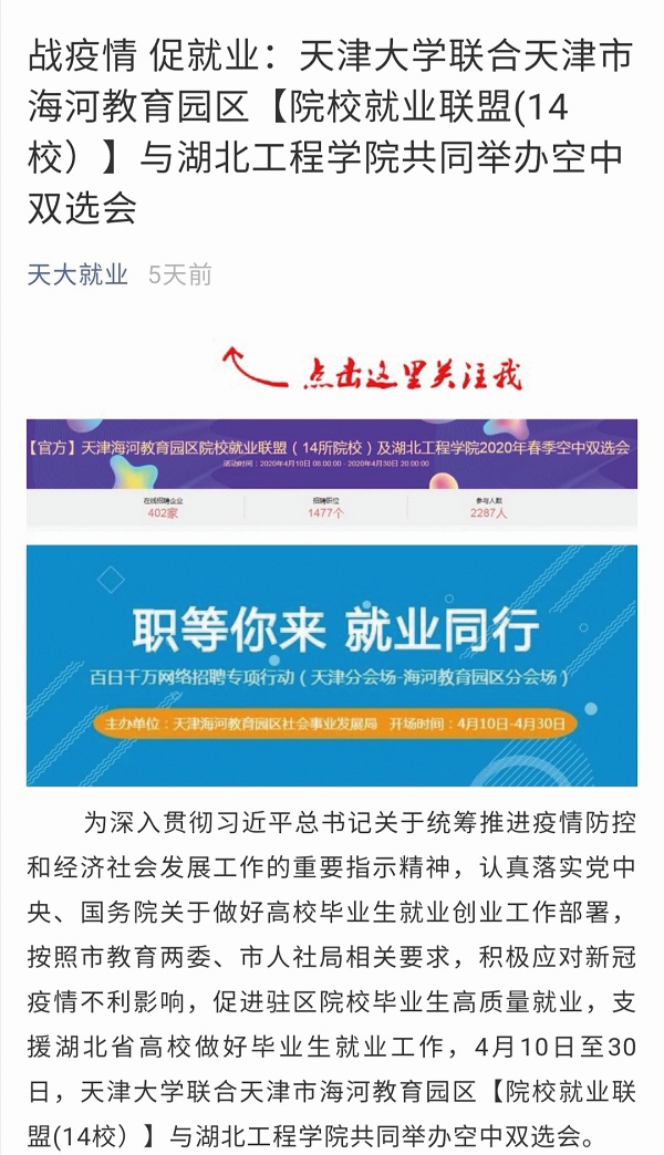 目前,我校已联合天津市海河教育园区院校就业联盟(14校)与湖北工程学院共同举办了空中双选会、联合湖北工程学院依托滨海新区开展湖北籍学生专场网络招聘会。4月29日,天大与湖北工程学院通过视频会议的形式,举行两校合作协议云签约仪式,落实帮扶措施,确保毕业生顺利就业。