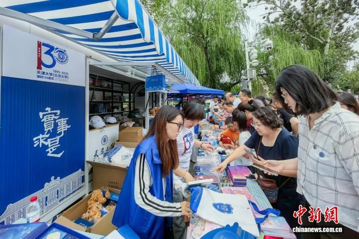 10月2日,校友在天津大学卫津路校区内购买建校130周年文创产品。中新社记者 佟郁 摄