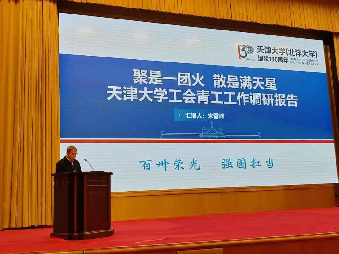 天津大学工会常务副主席宋雪峰以《聚是一团火,散是满天星》为题分享了天津大学工会青工工作调研报告。天津大学工会坚决贯彻落实习近平总书记关于工人阶级和工会工作的重要论述精神,在学校党委的领导下,以2011年开展的“优秀青年教师暑期实践营”为起点,以2012年成立的“天津大学青年教师联谊会”(以下简称“青椒会”)为基础,通过14年的创新实践,形成了以青椒会为主体,搭建起青年教师思政引领平台、成长成才平台和建功立业平台,打造了“青椒沙龙”“椒峰高地”“三尺讲台”“点亮天大”“走进系列”“幸福工程”六大板块。宋雪峰以精练的语言全面介绍了我校青工工作的具体举措、突出成绩,总结出三条基本经验。一是建立青年组织,夯实青年教师教育培养工作的组织基础;二是坚持党的领导,加强对青年教师组织的思想政治引领;三是打造特色品牌,创造助力青年教师健康成长的广阔平台。宋雪峰在报告中专门介绍了在天津大学建校130周年之际,习近平总书记给我校全体师生重要回信内容,以及组织青年教师学习重要回信精神的情况。