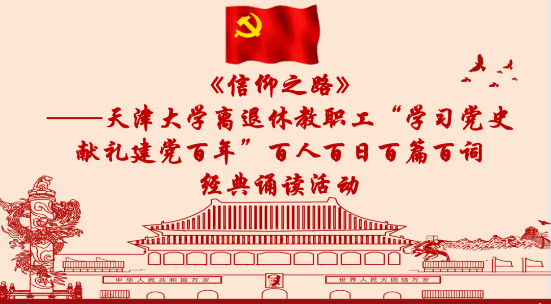 心使命,做到学史明理、学史增信、学史崇德、学史力行,在新时代不断加强党的建设,汲取不断前进的智慧和力量,离退休工作处在全校离退休教职工中举办《信仰之路》——天津大学离退休教职工“学习党史 献礼建党百年”百人百日百篇百词经典诵读活动,充分展现我校离退休教职工爱党爱国的深厚情怀、昂扬向上的精神风貌和永葆政治本色的坚定信念。