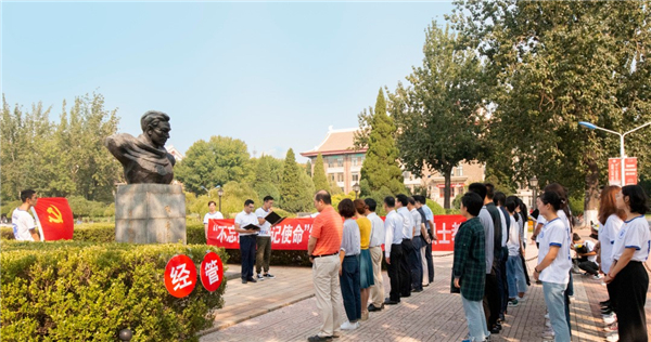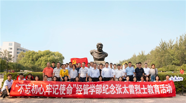 现场教学结束后,学部党委中心组、师生党员共聚太雷像前,向张太雷烈士致敬。本科生田烁朗诵原创作品《太雷颂》。“太雷精神今犹在,当年北洋新气象”,在她声情并茂地朗诵中,党员同志们更加深刻地感受到身上责任之重,吾辈应担当起革命重任,传扬爱国奉献精神。朗诵结束后,由学生代表为张太雷烈士献花,全体师生向张太雷烈士像三鞠躬,以最崇高的敬意祭奠为国捐躯的革命先烈,表达对烈士无限的哀思和崇敬。最后,管理与经济学部党委书记马寿峰同志带领全体师生党员代表重温入党誓词,一句句铿锵有力的誓言让大家再次深深地感受到了身为党员的责任、使命和荣耀。