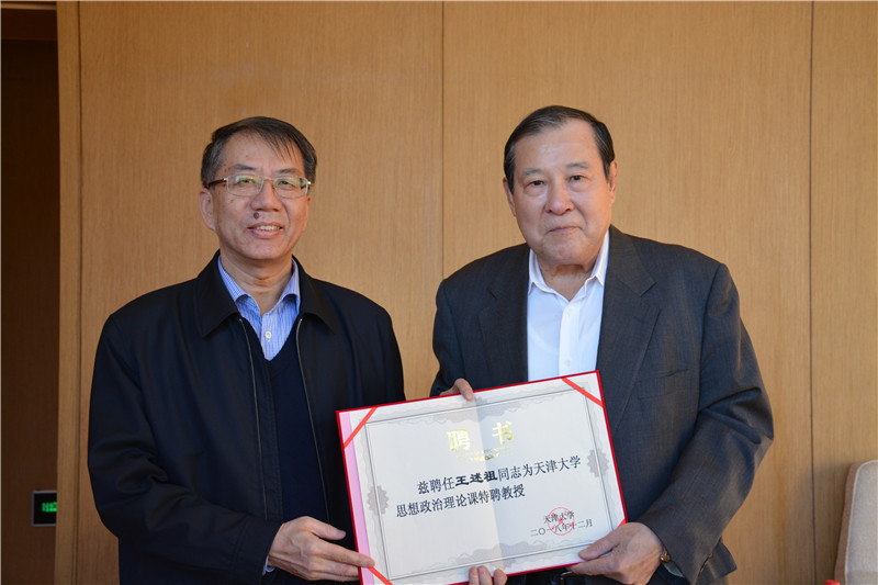 本站讯(通讯员刘珂 王春馨)12月13日,改革开放第一代“创业者”、天津市原副市长王述祖做客“北洋大讲堂”,在北洋园校区郑东图书馆报告厅,为天大师生们带来一场题为《我与改革开放40年:决定当代中国命运的关键抉择》的讲座,并接受了天津大学马克思主义学院的聘请,成为天津大学思政课特聘教授。天津大学党委副书记、纪委书记孙广平会见了王述祖,并为他颁发聘书。