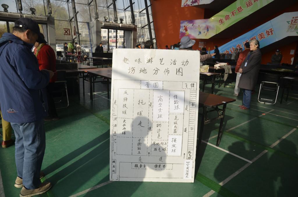 早上7点,天刚蒙蒙亮,退协工作人员就早早来到体育馆西侧大厅,按照游艺项目要求开始布置场地。游艺项目的设置充分考虑到老年人的实际特点,既有热烈的竞技性,又富趣味性、安全性。偌大的馆厅被分隔成若干个小场地,工作人员与裁判在布置完成后,又投入了道具调试和竞赛测验,根据实际测试情况及时调整计分规则。