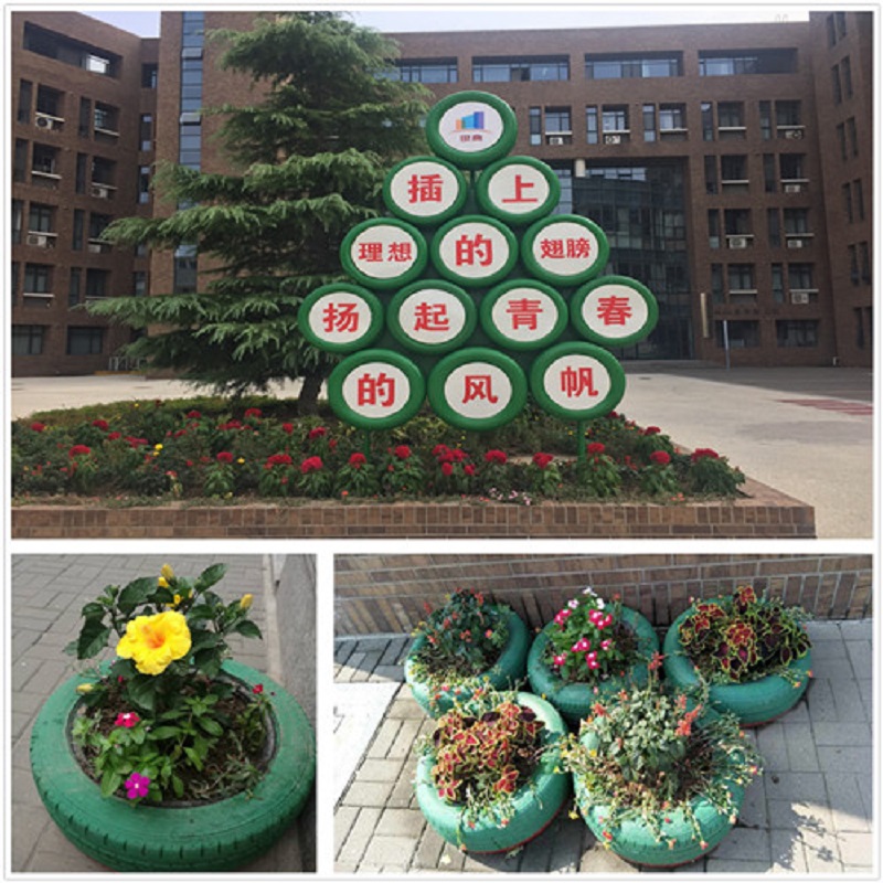 物业方面从7月中旬开始制定计划,首先选购了一批大小、厚度相近的废旧轮胎,集中对其进行除尘、刷漆,然后选定在26教学楼A、B、C区墙边进行摆放、填土,同时栽种紫叶草、太阳花、牡丹花、五瓣莲等成活率高、颜色鲜艳的花卉,并由专业人员对花卉进行浇水和精细化管养。为了营造积极向上的校园文化,美化校园环境,物业方面开拓思路,结合自身岗位专业优势,利用木板和轮胎设计、焊接了一个大型展牌,树立在C区前广场大松树旁。