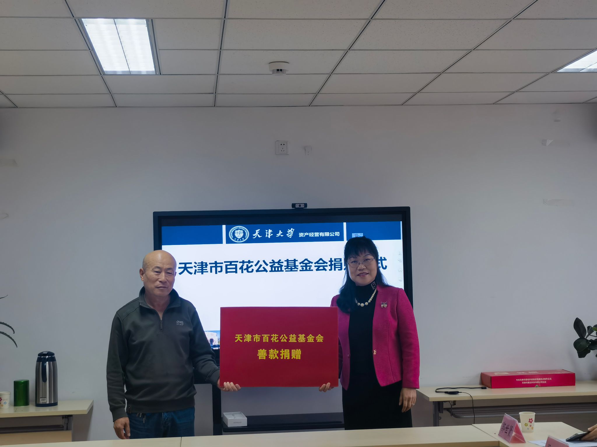 在老年大学会议室中,资产公司举办了百花基金捐赠仪式,孙永利首先代表资产公司对提供本次捐赠的天津市百花公益基金会表示了崇高敬意,向出席本次活动的退休支部书记们致以节日的深情问候。赵翠云代表资产公司接受了百花基金会的善款,此笔善款将用于为校企困难职工发放生活补助。