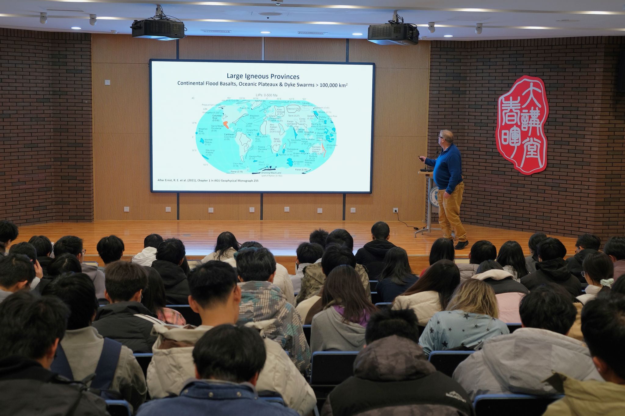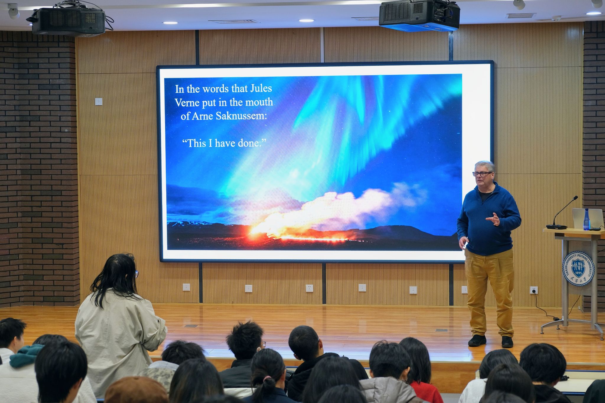 讲座伊始,Ellam教授以儒勒·凡尔纳的科幻小说《地心历险记》为切入点,将文学想象与现代科学研究巧妙连接,引发了现场观众对地球内部世界的浓厚兴趣。从小说中的冰岛火山口出发,他讲述了自己跨越四十余年、遍及五大洲的科研历程——从苏格兰岛屿的岩石断层,到意大利西西里岛的活火山,从非洲大陆的火成岩高原,到冰岛的热源与裂谷系统,是真正意义上的“全球地心探险”。