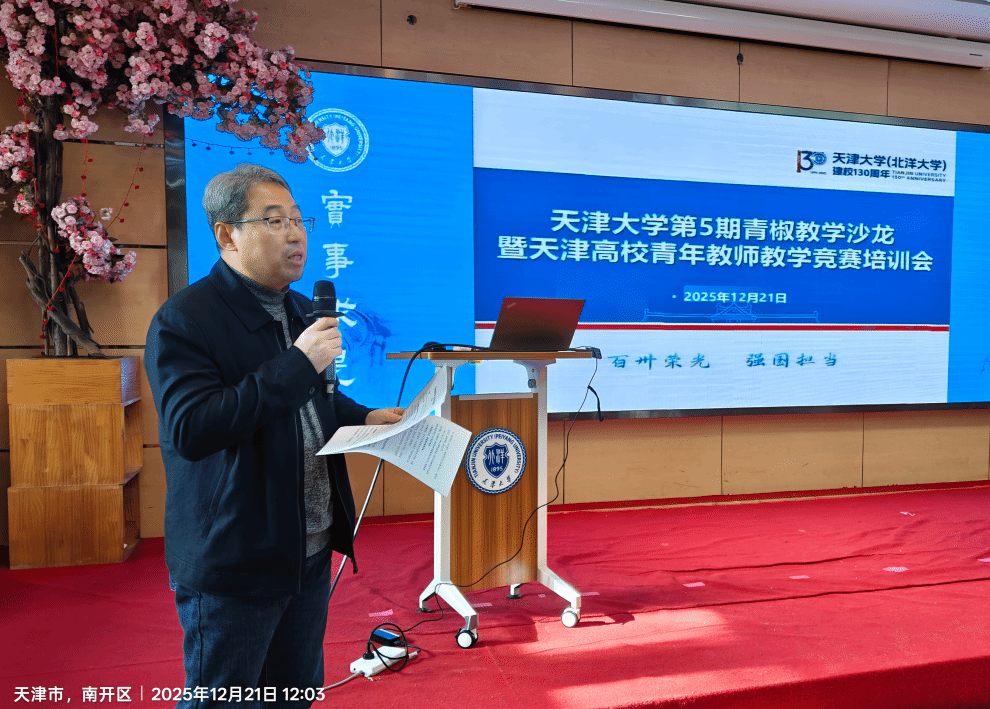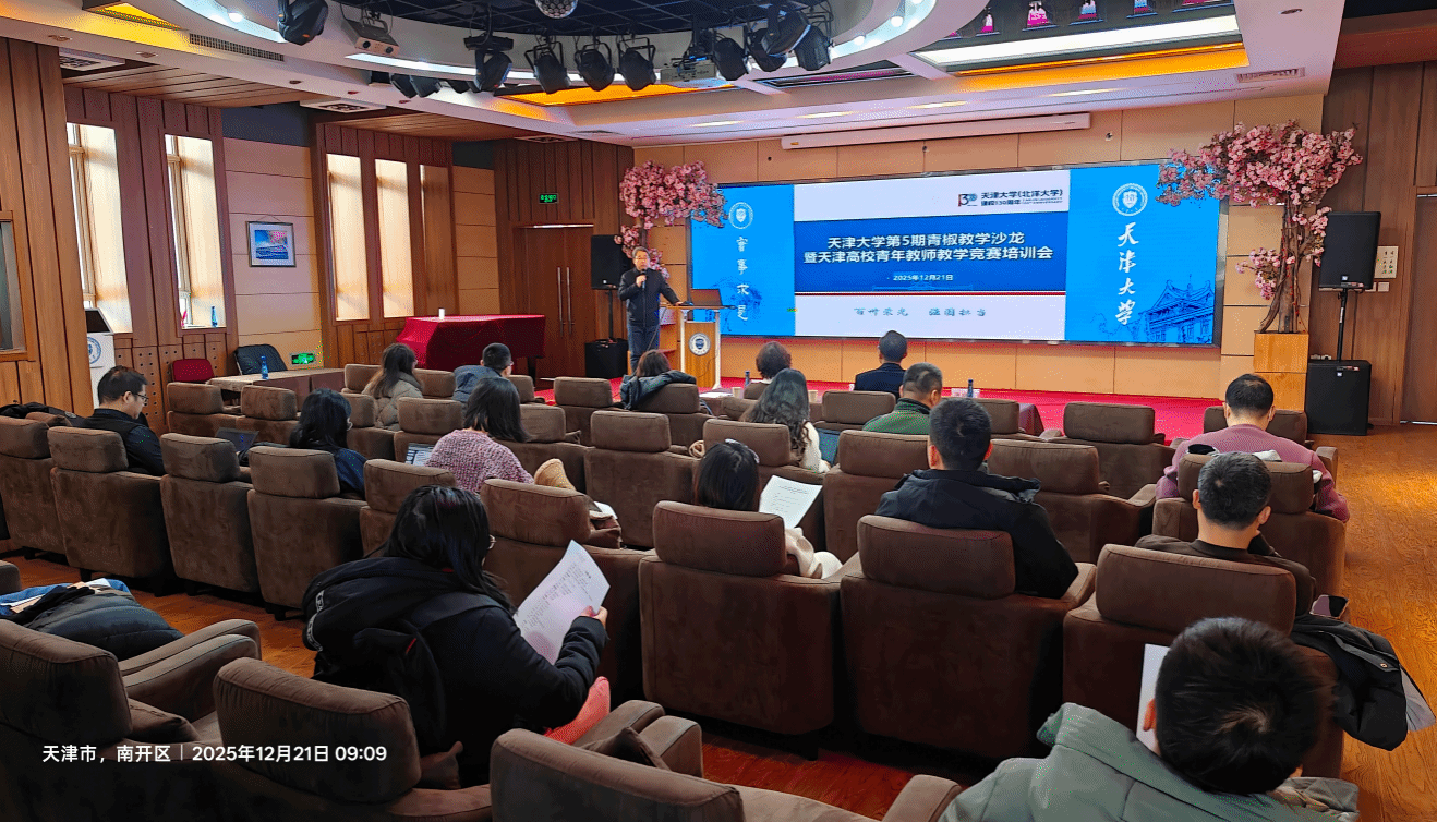 12月21日,天津大学第5期青椒教学沙龙暨天津高校青年教师教学竞赛(下称“青教赛”)培训会在卫津路校区教职工文化活动中心多功能厅举办,思政课组、文科组、理科组、工科组、医科组5个组别的青教赛选手参加培训,材料学院教授赵乃勤、理学院教授杨秋华、自动化学院青年教师陈晓龙作专题辅导。活动由工会常务副主席宋雪峰主持。