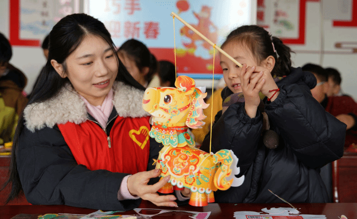 2026年2月12日,在江苏省海安市墩头镇新时代文明实践站,志愿者陪同当地留守儿童一起做新年饰品。
