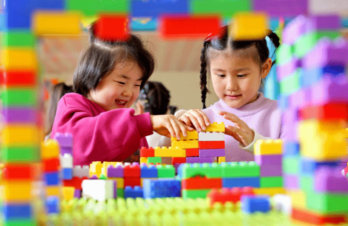 2025年11月6日,在山东省枣庄市市中区西王庄镇中心幼儿园,托育班的小朋友在拼搭积木。