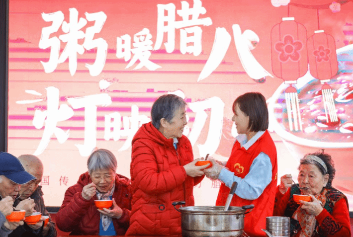 2026年1月26日,在山东省青岛市李沧区颐福养老院,志愿者为老人们送上腊八粥。