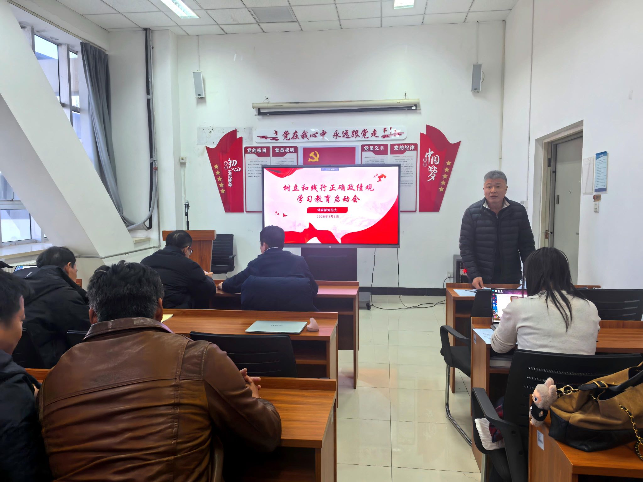 为深入学习贯彻习近平总书记关于树立和践行正确政绩观的重要论述和重要指示精神,全面落实党中央决策部署和学校党委工作要求,3月6日,体育部党总支在卫津路校区体育场A204活动室召开树立和践行正确政绩观学习教育启动会。党总支书记李磊作动员讲话,副书记范洪成详细解读学校工作安排并作出重要部署,体育部、场馆中心全体党员参加学习。