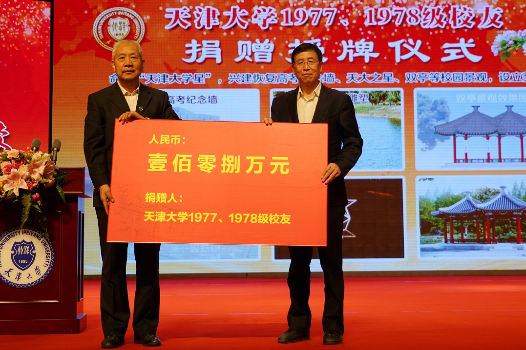 为感恩母校培养、纪念入学40周年,校友们纷纷慷慨解囊、踊跃捐资,命名“天津大学星”,兴建“天大之星”景观、兴建“恢复高考纪念墙”、双亭,设立奖学金等等。纪念大会筹备组负责人之一姚振国校友作为代表向母校捐赠,李家俊代表学校接受捐赠并授予捐赠证书。