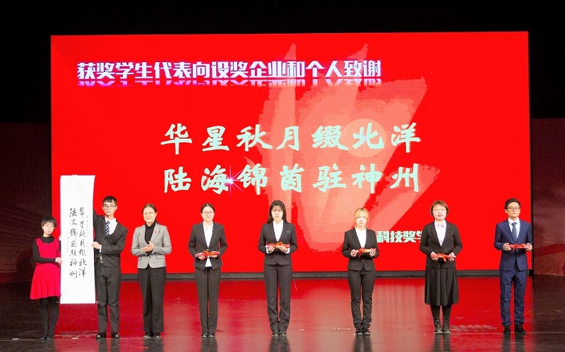 表彰大会上,校领导和捐赠方代表为获奖学生代表颁奖。此外,为了表达对捐赠企业和个人的感谢,资助育人工作室精心为每个设奖单位或个人准备一份书法作品表示对捐赠人的感谢。获奖学生代表还在现场朗诵了《泱泱华夏,巍巍天大,以梦为马,征程天下》。