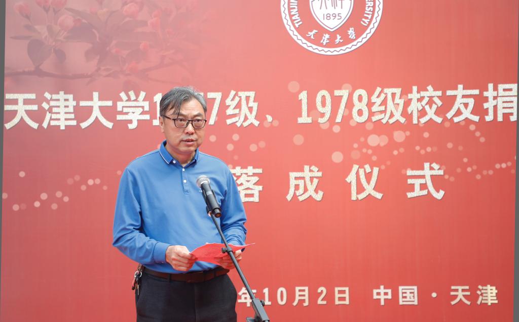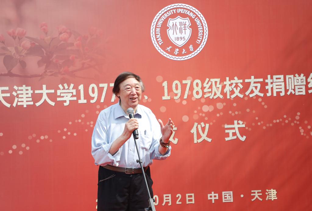 本站讯(通讯员 董玥欣 摄影 唐蒙)10月2日上午,在天津大学迎来建校126周年之际,由1977、1978级(以下简称77、78级)校友捐建的纪念亭在卫津路校区青年湖畔落成。天津大学党委书记杨贤金,天津大学原党委书记李家俊,天津大学冯骥才文学艺术研究院院长、著名作家、画家、文化学者冯骥才,天津市人大常委会原副主任张元龙校友,国家知识产权局副局长何志敏校友,天津市规划和自然资源局党委委员、一级巡视员路红校友,天津工业大学原党委书记张宏伟校友,天大天津校友会秘书长姚振国校友,天津大学副校长张凤宝等共同为纪念亭揭幕。