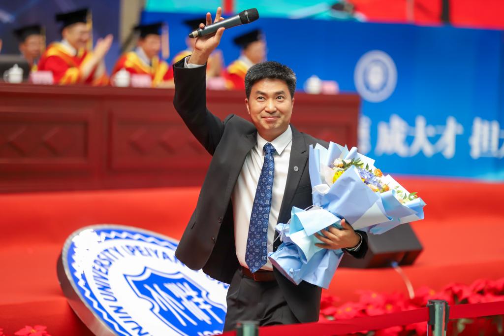 “同学们还记得四年前是哪一天来到天大的吗?是2019年8月28日。那天我一大早儿就等在迎新帐篷,期待你们的到来!”材料学院王颖老师作为教师代表回忆了四年来与同学们朝夕相处的难忘点滴,她深情寄语学子,虽然结束了本科生涯,但是每个人都有一个终身课题,那就是成长,她希望同学们能够始终保持正确的方向、始终保持乐观积极的人生态度、始终为自己赋能。“就要说再见了,那么就让我在你临别的行囊中,放一份担当、一缕阳光和一泓清泉吧。选择了为国担当,就选择了正确的方向;心中有阳光,前进路上就拥有了战胜挫折的光芒;源泉混混,不舍昼夜,保持终身学习的澎湃能量,必将跑出新时代天大人的昂扬!”