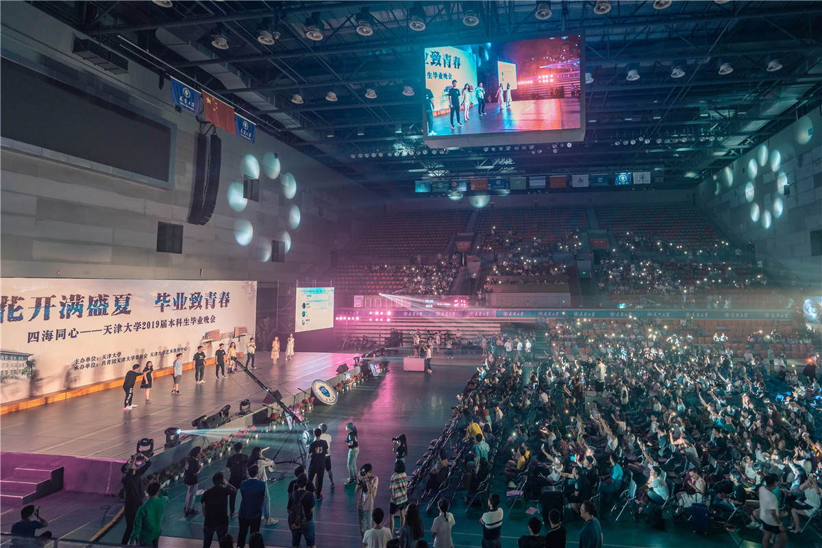 毕业歌会同学们动情演唱共同追忆大学生活,千人合唱《我和我的祖国》和《天津大学校歌》,五星红旗和天大校旗在观众席两侧红色的海洋中交相呼应,熠熠生辉。