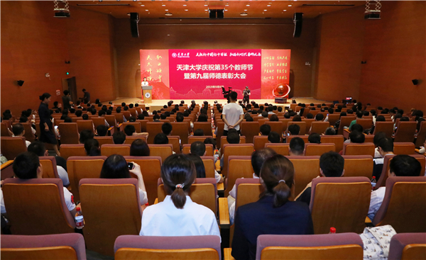 本站讯(通讯员陈少丹 摄影记者唐蒙郭程)在第35个教师节来临之际,为表彰天津大学涌现出来的一大批先进集体和优秀教师,学校于9月6日上午在北洋园校区郑东图书馆报告厅隆重举行天津大学庆祝第35个教师节暨第九届师德表彰大会。党委书记李家俊、校长金东寒、副校长元英进、副校长张凤宝、党委副书记赵美蓉、副校长巩金龙、校长助理张力新、总会计师古瑶、校长助理刘宁等校领导出席会议。各院级单位、机关部处室、直属单位主要负责人,2019年度“教书育人、管理育人、服务育人”先进工作者、师德建设先进集体、“我心目中的好导师”、“沈志康奖教金”等奖项获奖教师,以及第十一期入职培训学员代表等300余人参加了表彰大会。大会共包括两个部分,第一部分为《天津大学师德公约》发布仪式,第二部分为师德典型颁奖典礼。大会由党委副书记赵美蓉主持。