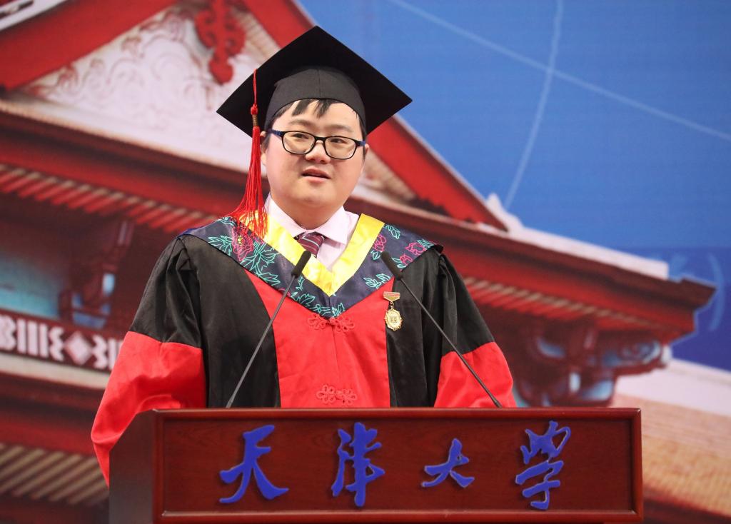 精仪学院博士生蒲治华作为毕业生代表发言。在天大求学的六年时光,他收获了科研成果,收获了荣誉,收获了爱情和家庭。这个“在实验室放假的人”以第一作者发表学术论文18篇,其中两篇作为封面文章发表于本领域排名第一的SCI一区期刊上,并在领域内顶级的国际学术会议上做大会报告两次。他还担任班长、党支部委员,博士生会副主席,参加北洋合唱团,做“残奥会”志愿者……在他看来,要想破茧成蝶,就少不了痛苦煎熬;要创造美好生活,就必须不懈奋斗。他也号召大家一起,继续秉承天津大学实事求是的校训,不忘初心,努力奋斗,在建设祖国、实现民族复兴的各条战线上,追逐天大梦想,做出彩天大人。