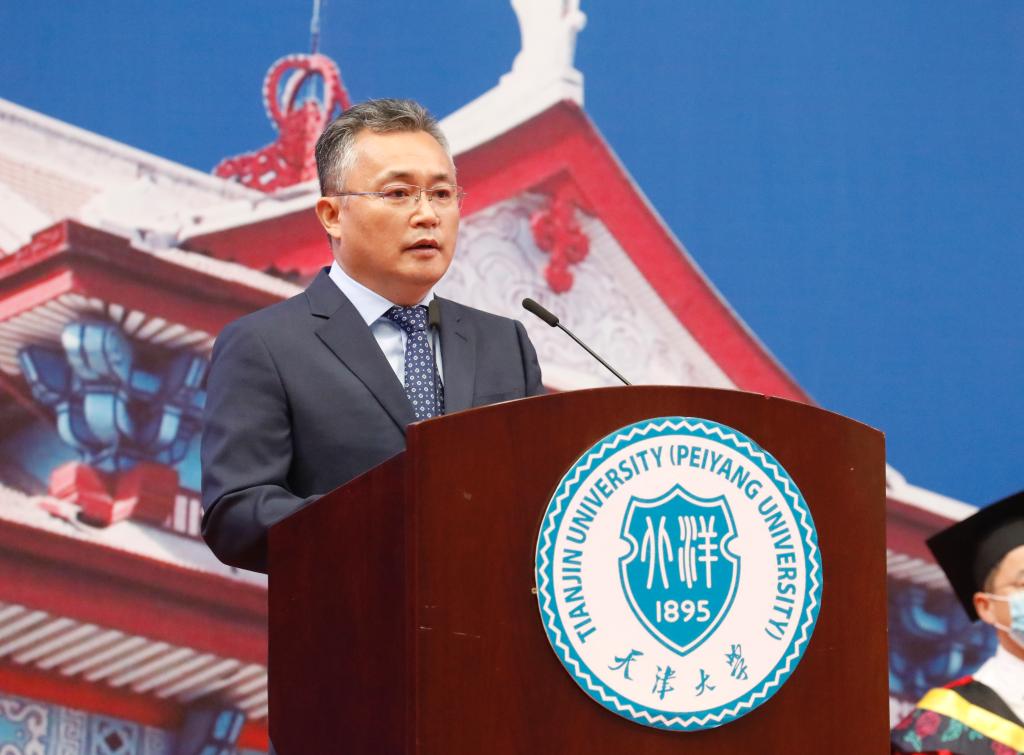 金东寒在毕业典礼上作题为《争做堪当民族复兴重任的时代先锋》的讲话,他勉励同学们要坚定理想信念,筑牢先锋之魂;要坚守创新进取,锻造先锋之能;要坚持拼搏奋斗,增强先锋之勇。他说,“中华民族伟大复兴的前进步伐势不可当,天大学子爱国报国、建功立业可谓正当其时。”他希望作为新百年奋斗征程上第一批走出天大校园的青年,肩负着民族复兴的伟大使命,应当自觉站在时代前列,以先锋姿态奋勇前行。