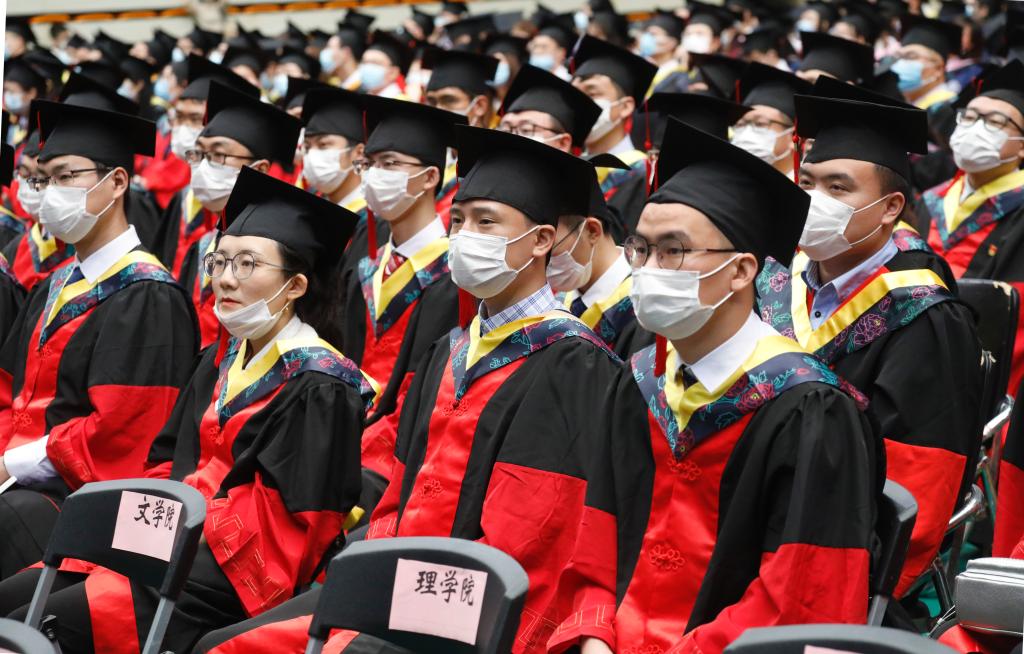 典礼结束前,全体师生齐唱校歌。随后,现场毕业生依次走上主席台,由校领导、学位委员会委员代表为他们授予学位、拨动流苏。