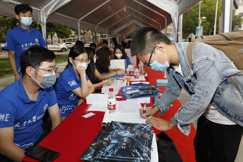 为了让每一位新生都能够拥有独一无二的、难忘的天大初体验,天津大学各学部学院都在自己的迎新点位精心准备了独具特色的迎新活动和礼物。建工学院迎新点附近,一张巨大的中国地图引起了不少新生的注意。新生可以报到处领取一枚校徽,将其放置在地图上的家乡处。而地图上“移山填海,建功立业”这句大气磅礴的口号也是格外亮眼。 “这句口号既是我们建工人的追求,也是建工学院的精神。希望能唤起新生对祖国对‘求学城市第二故乡’的热爱之情。” 建工学院2021级硕博辅导员孟子健介绍道。数学学院的迎新站点则请出了可爱的学院吉祥物——小π助力迎新。“π是数学的终极魅力。看到小π就好像看到了天大数院无穷的创造力。” 2021级研究生新生刘凯在报到的时候情不自禁地抚摸着小π的头笑着说道。地球系统科学学院迎新点前长长的立牌上便简明扼要介绍了天津大学的历史,地科院的学生培养方向目标、国际交流项目、科学研究成果等。迎新点内厚厚的迎新礼包里为新生们准备了实验室安全手册、研究生的入学须知、设计精美的院徽等帮助新生们对于即将到来的大学生活进行全面的了解。针对今年的迎新,分子+研究院特别推出“以老带新”新老生结对子的暖心举措,为每个新生结对一名高年级党员同学,从入学开始,包括行李搬运,宿舍引导、报到手续、生活品采购、校园熟悉、学业准备、经验传授、答疑解惑等方方面面,给予每位新生无微不至的关怀与呵护。新媒体与传播学院的迎新点前竖立着设计新颖、特色鲜明的拍照墙,新生们的脸上洋溢着入学的喜悦,纷纷前往拍照纪念。“虽然离开了家,但看到学院为我们精心准备的各种暖心礼物,我真真切切的感受到这里是我的第二故乡!”新媒体与传播学院2021级硕士生陈卉垚说到。