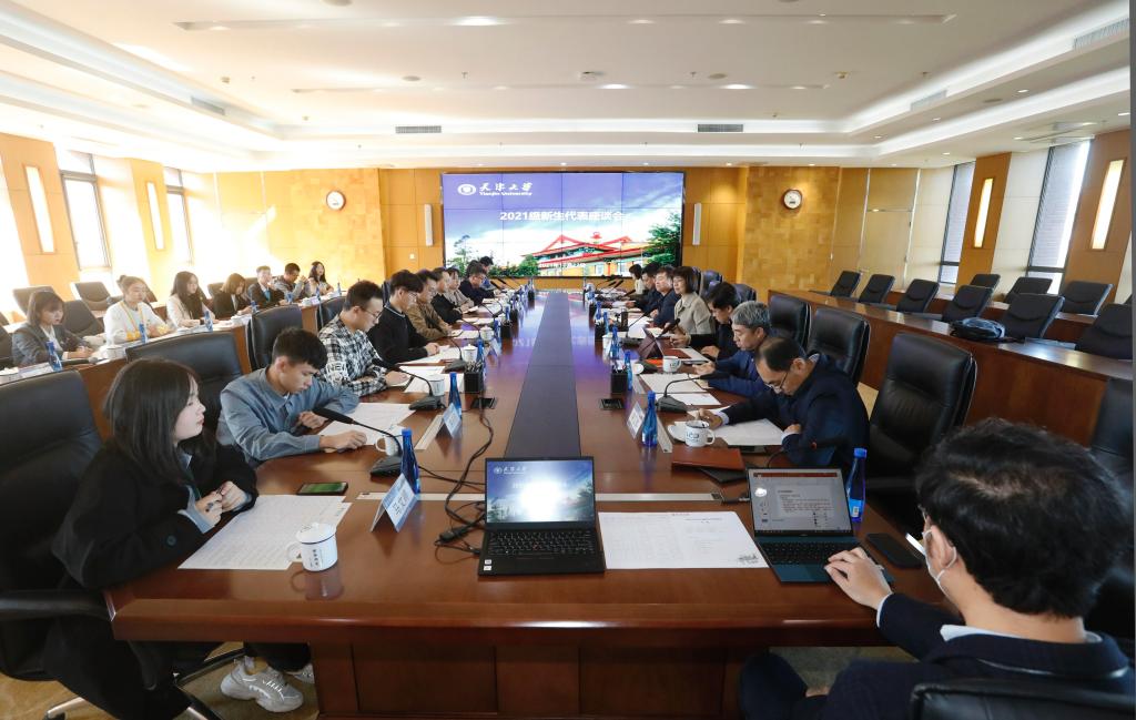 本站讯(记者 董玥欣 摄影 唐蒙)10月22日上午,天津大学2021级新生代表座谈会在北洋园校区召开。校长金东寒、党委副书记雷鸣出席座谈会,党办校办、学工部、校团委、教务处、国际合作与交流处、后勤保障部、研究生院、保卫处等相关部门负责人参加了会议。会议由党委学生工作部部长赵欣主持。