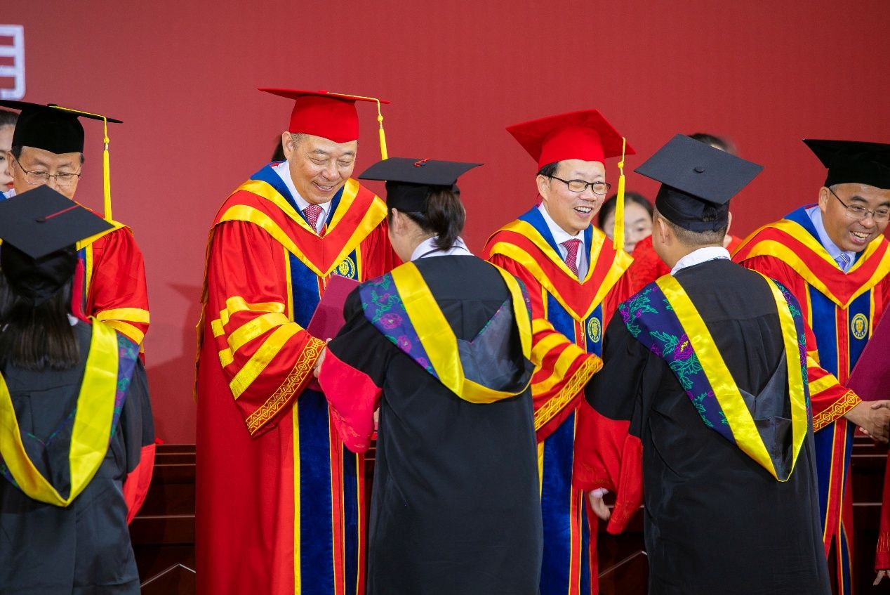 典礼在全体毕业生齐唱校歌中落下帷幕。随后,现场毕业生依次走上主席台,由校领导、学位委员会委员代表为他们授予学位、逐一拨穗。