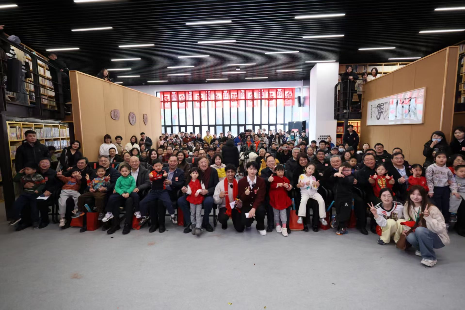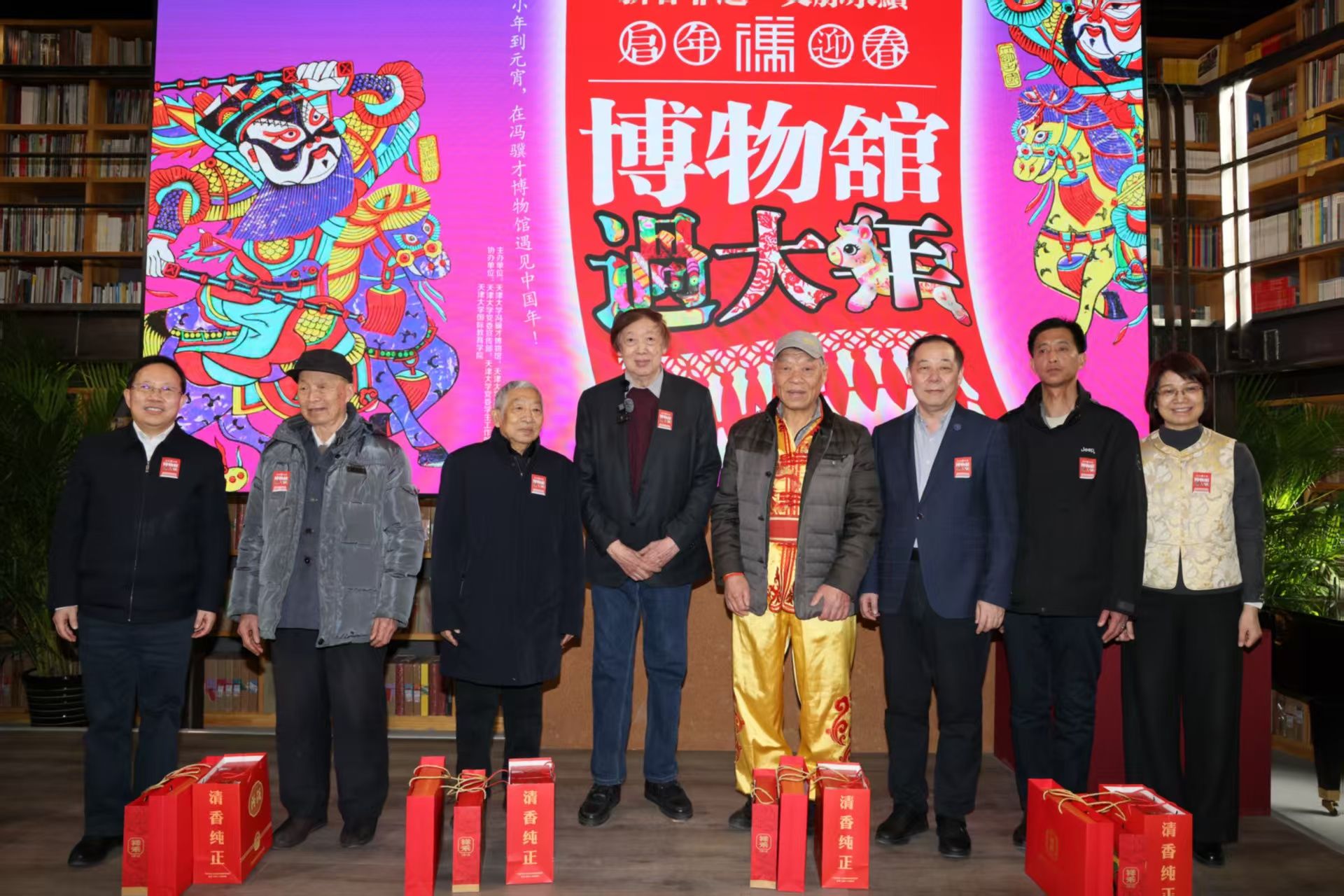 小年当天,天津大学党委书记杨贤金、校长柴立元、党委常务副书记雷鸣等校领导都来与师生们欢聚一堂。冯研院直属党支部书记张俊艳宣布活动正式启动。启动仪式台上,冯研院的非遗学硕士生与国教学院的埃及留学生搭档主持;台下,天津大学附属幼儿园的孩子们在嘉宾怀中一起观看百花龙狮团腾跃翻转、精彩迭出的表演。“杨柳青木版年画”国家级代表性传承人霍庆有、天津市级传承人王学勤,“挂甲寺庆音法鼓”国家级代表性传承人傅宝安,“海下同善文武高跷”天津市级传承人张永环也来到现场,从冯骥才先生和校领导手中接过年礼。