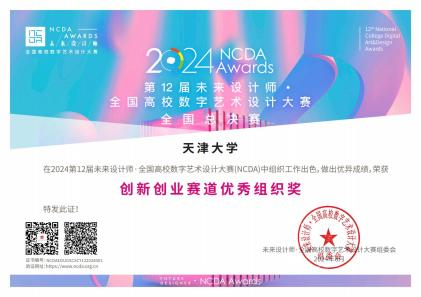 本站讯 近日,第十二届“全国高校数字艺术设计大赛(未来设计师NCDA大赛)” 全国总决赛评审工作落下帷幕。本届大赛全国共有1891所高校参赛,共征集298763件作品,设立29个省级赛区;985、一流大学参赛率达95.2%,设计学学科评估C-以上高校100%参赛。参赛作品经校赛、资格赛、省级初赛、省级决赛、全国总决赛,评选出国赛一二三等及优秀奖(创新创业赛道除外)。天大学子成绩斐然,在国赛中共荣获一等奖4项、二等奖7项、三等奖5项,共计16项的优异成绩。同时,秦俊男、王鹤、张毣、赵伟4位老师获评优秀组织教师,秦俊男、王鹤老师还获评创新创业赛道优秀组织教师。作为组织单位,天津大学荣获杰出组织奖和创新创业赛道优秀组织奖。