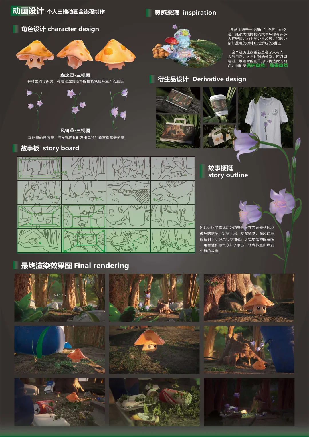 一等奖作品《守护》。该作品的作者为杨滢嘉,指导教师为李兴、秦俊男。短片讲述了森林深处的守护灵在家园遭到垃圾破坏的情况下挺身而出,挽救植物。在风铃草的指引下守护灵巧妙地避开了垃圾怪物的追捕,用智慧和勇气守护了家园,让森林重新焕发生机的故事。
