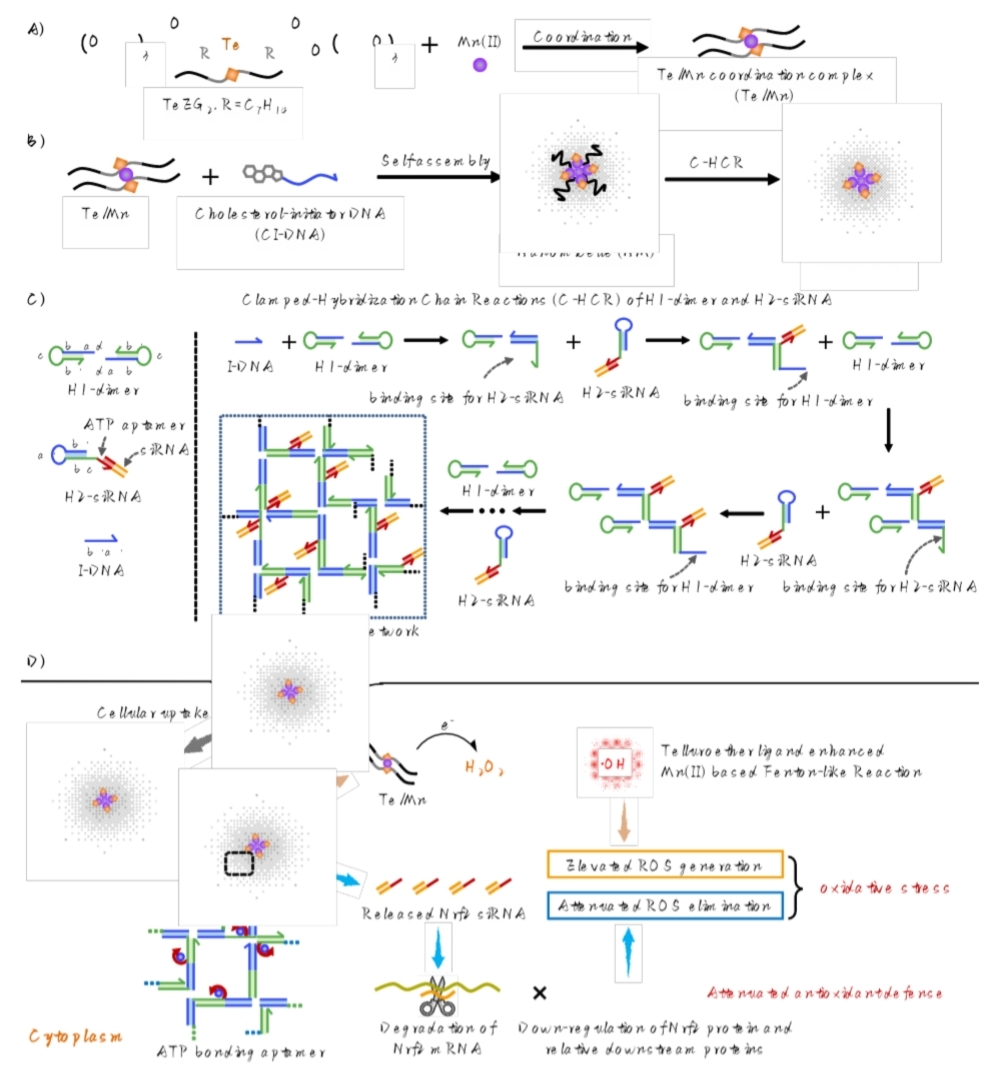 仰大勇教授课题组构筑了一种超分子自组装DNA纳米系统,通过化学和基因协同调控增强肿瘤细胞的氧化应激,实现了对肿瘤的高效抑制和治疗(图1)。作者首先合成了两亲性碲醚(TeEG2),并与Mn(II)配位形成复合物(Te/Mn),Te/Mn与胆固醇修饰的DNA共组装生成具有类芬顿催化活性的DNA杂化纳米胶束。锚定在纳米胶束表面的DNA作为引发链触发发卡DNA(H1和H2)进行级联钳式杂交链式反应(C-HCR),实现纳米胶束界面上的DNA网络动态组装。发卡H2末端修饰ATP适配体,通过碱基互补配对与核酸药物siNrf2连接,实现siNrf2在DNA网络的高效负载。TeEG2具有出色的σ供电子能力,可促进电子从Mn(II)到H2O2的转移,提高了Mn(II)对类芬顿反应的催化活性,在肿瘤细胞中产生大量高毒性∙OH,实现对肿瘤细胞的化学调控。同时,在肿瘤细胞内ATP分子驱动下,DNA网络中的ATP适配体发生变构,实现siNrf2的特异性可控释放,下调转录因子Nrf2及其相关抗氧化酶的表达,实现对细胞的基因调控。体外和体内实验均表明,基因调控可与化学调控协同作用显著增强肿瘤细胞的氧化应激,从而抑制肿瘤细胞的生长。