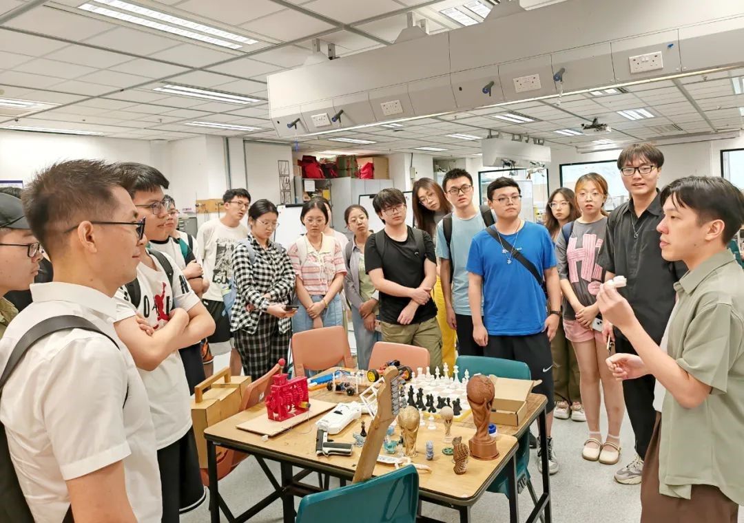 随后,学生参观了港科大的USEL实验室,这是港科大为本科生提供的一个可以充分发挥学生自主创造性、完全靠学生设计、搭建并维护的平台。在这里学生可以利用多样的机械工具、3D打印和人工智能等先进技术和设备,创造自己设计的工艺品或产品。不同专业的同学聚在USEL实验室中,一起交流经验心得,尽情地擦出思维碰撞的火花。