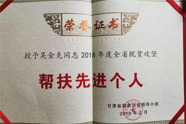 挂职干部的工作也得到了当地党委、政府的高度认可,吴金克被评为甘肃省2018年度全省脱贫攻坚帮扶先进个人。