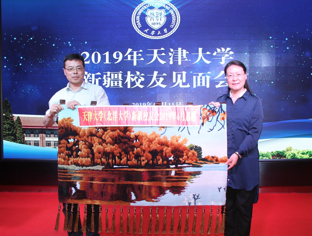 新疆校友会向母校赠送特色挂毯,表达对天大培育的拳拳之意,赵美蓉代表学校接受捐赠并回赠母校纪念品。