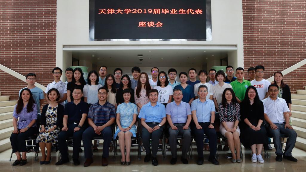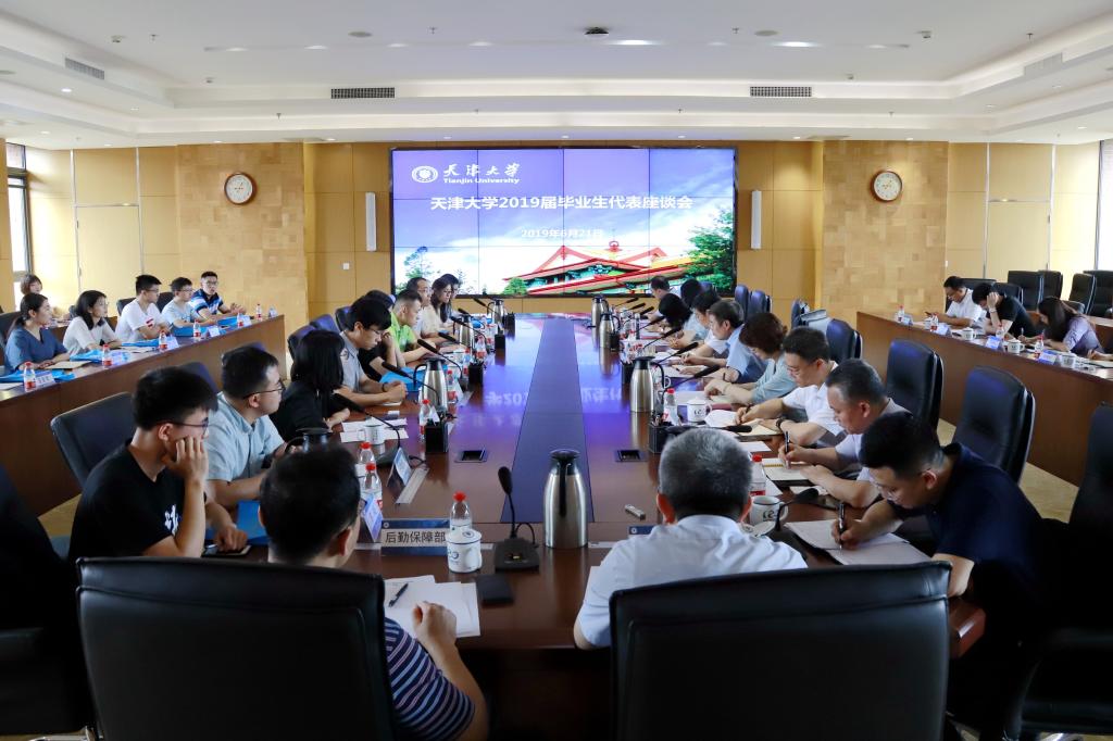 6月21日上午,天津大学2019届毕业生代表座谈会在北洋园校区召开。校长金东寒,党委副书记雷鸣,党委常委、宣传部部长贾启君出席了座谈会。党办校办、组织部、学工部、校团委、教务处、研究生院、科研院、国际合作与交流处、校友与基金事务处、保卫处、后勤保障部、图书馆、场馆中心、信网中心等相关部门负责人参加了会议。