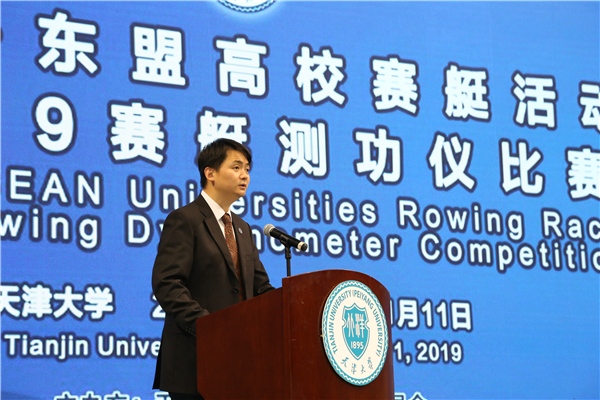巩金龙代表天津大学致辞,对各位来宾的到来表示诚挚的欢迎与衷心的感谢。他认为,在中华人民共和国成立70周年、中国东盟建立战略伙伴关系16周年这一友好节点,大家齐聚天大开展赛艇运动交流活动,不仅是庆祝与纪念,更是表达了我们携手走向美好未来的愿景。巩金龙表示,天津大学会在“一带一路”倡议的指引下,继续发挥中国-东盟智慧海洋中心载体作用,为中国和东盟高校间的合作交流提供更多更好更务实的平台;同时也会以体育文化交流为契机,继续推进天津大学和东盟高校在人才培养、科学研究、文化交流等方面的合作交流。