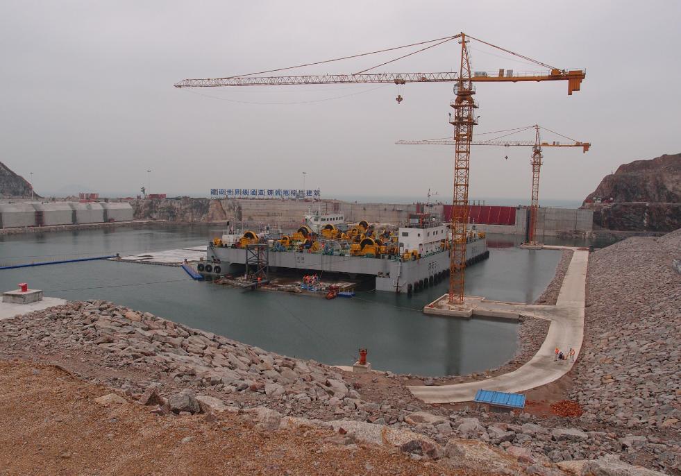安装船和沉管在深水坞连接后等待出运的现场考察照片