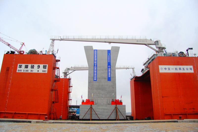 港珠澳大桥桥墩预制件在半潜驳运输船上拖运