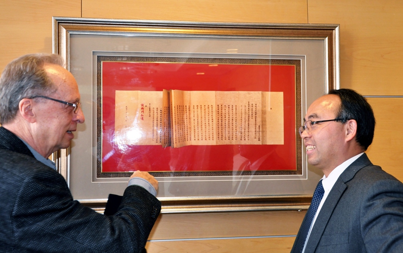 最后,胡文平副校长还向Celso Grebogi教授展示了奏请创办北洋大学的奏折、中国的第一张大学毕业文凭以及国家领导人视察天津大学的图像,展现了天津大学的历史。