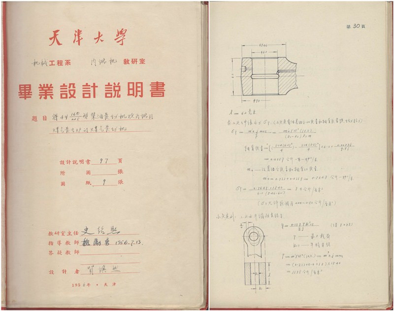 今年已84岁的贺焕然于1951年至1956年就读于天津大学机制系。在贺焕然捐赠的手稿中,一份厚厚的毕业设计格外引人瞩目,也是贺老最珍贵的青春纪念册。这份包含当时全部图纸和设计内容的毕业设计手稿是在天津大学史绍熙老校长的指导下完成的。贺老至今仍清楚地记得毕业答辩时史校长对自己的提问:“你认为现在内燃机发展的主力应集中在哪些类型的车?”贺老说:“当时我的回答是轿车,可是史校长指正了我,他说‘祖国正处在建设时期,我们更应该发展运输车。’正是因为史校长严谨的治学态度,使我们常常谨记国家对自己的培养,处处严格要求自己,时时砥砺自身努力学习回馈于社会。我想,这就是我们天大人的家国情怀。”