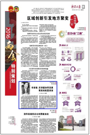 全国人大代表、天津大学校长李家俊就京津冀协同发展发表意见说,京津冀协同发展是国家区域发展的重大战略。京津是中国科技教育资源最密集的地区,坐落有上百所大学和一大批高水平科研院所,聚集了成千上万的高科技公司。实施京津冀协同发展规划,必须能够高效配置这些科技资源,充分发挥高校和科研院所在创新驱动发展中的重要作用。