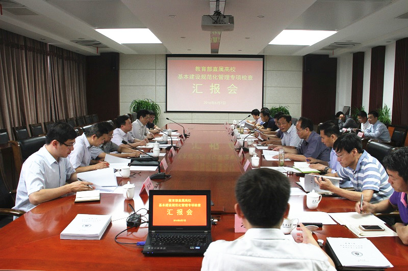 基建处处长刁可详细汇报了学校在建项目规范化管理、中央预算内投资建设项目及学校“十三五”基建规划编制的有关情况。检查组听取汇报后,实地查看了机械教学组团、综合教学实验楼、图书馆、行政楼、主楼的建设情况。