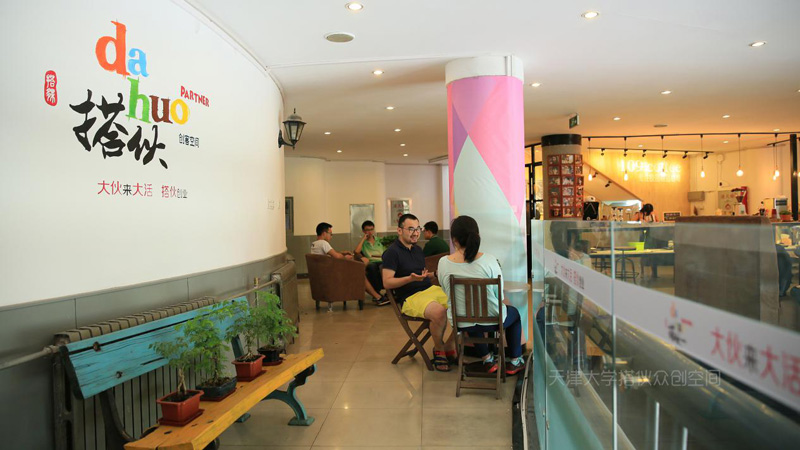 在“搭伙”众创空间的墙上有学生们手绘的一句话:“大伙来大活,搭伙创业”。“大活”是学生们对天津大学大学生活动中心的简称,而创业过程尤其需要搭伴前行、搭伙取暖。“搭伙”众创空间由两部分组成:卫津路校区“搭伙”和北洋园校区“搭伙”,总面积8000余平方米,承载创业咖啡、路演区、咨询服务中心,联合办公、小型会议、创业讲堂等功能,为入驻团队提供免费工位、无偿wifi接入、法律咨询、公司注册、驻校天使人投资等服务。