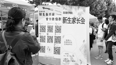 9月1日,中央财经大学新生报到现场,金融学院的学生邀请新生扫码入群。李涓 摄