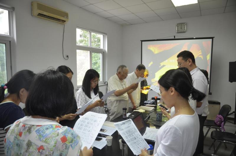 “我们不要做主报告,只在上面讲”。年近90岁的杨庆文老师拿出两份材料《从严治党锻造坚强领导核心》和《学习周恩来道德修养之道》,“把这个材料提前发给大家学习,当天,由咱们年轻同志唱主角,给我们讲,给我们提问,我们来解答”。为了让党课既有意义又有意思,老爷子竟然将时下最为流行的“翻转课堂”的思路引入到了此次党课活动中。”“上课“当天,同志们拿着厚厚的准备材料走进课堂,在集体学习了“教材”之后,两办二支部的同志们先后汇报了自己的学习体会。接着,三位老师开始“点评”。杨老师首先结合国际共产主义运动史、苏联共产党党史和中国共产党党史强调了党员的根本就是党性和信仰,并谈了自己对组织生活和交党费的认识;印老师讲到:“以作风建设为切入点落实全面从严治党的要求是党的十八大针对当前我国政治新常态发展而提出的新要求和新任务,加强作风建设,首先要坚持群众路线,当年我的入党联系人曾经给我提出三点要求:一是你是学生,首先要学习好;二是一定要联系好群众,做对群众有利的事;三是要提高警惕。所以我对群众路线教育非常有体会,群众路线从根本上讲是世界观的问题,党员是一种身份,更重要的是一种信仰,坚持真理,就会密切联系群众。薛老师说:从严治党的关键是对党员进行思想教育,加强党员党性修养,活到老,学到老,一个党员应不为名不为利,一心为革命事业和党的事业努力奋斗,真正做到全力以赴、全神贯注、心无旁骛。
